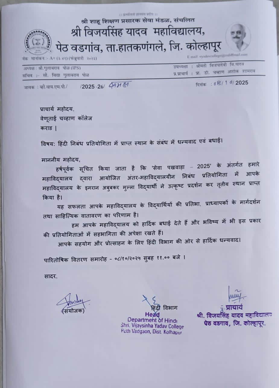 | 1 | इमरान अबुबकर मुल्ला | 10-08-2025 | University Level | सेवा पखवाडा '२०२५' अंतर- महाविद्यालयीन निबंध प्रतियोगिता | View | |
